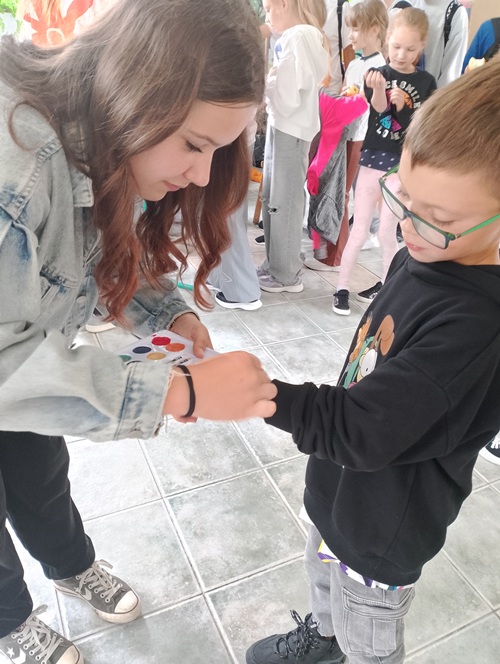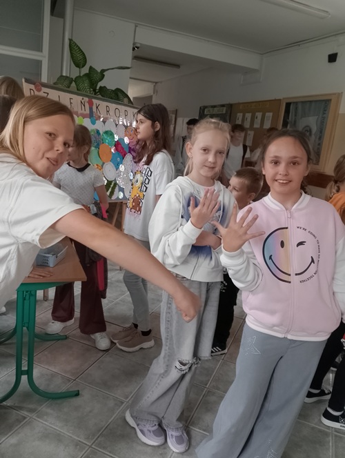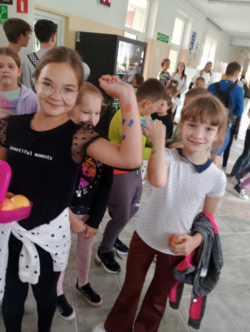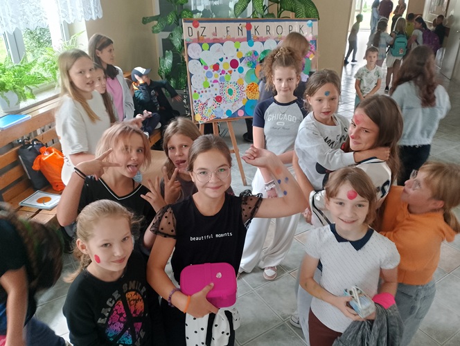 Podczas długiej przerwy, przy dźwiękach muzyki, starsi uczniowie malowali na twarzach młodszych dzieci kolorowe kropki. Powstała również specjalna tablica inspiracji, na której każdy mógł zaprezentować swoją wyjątkową kropkę – symbol twórczości i pomysłowości.