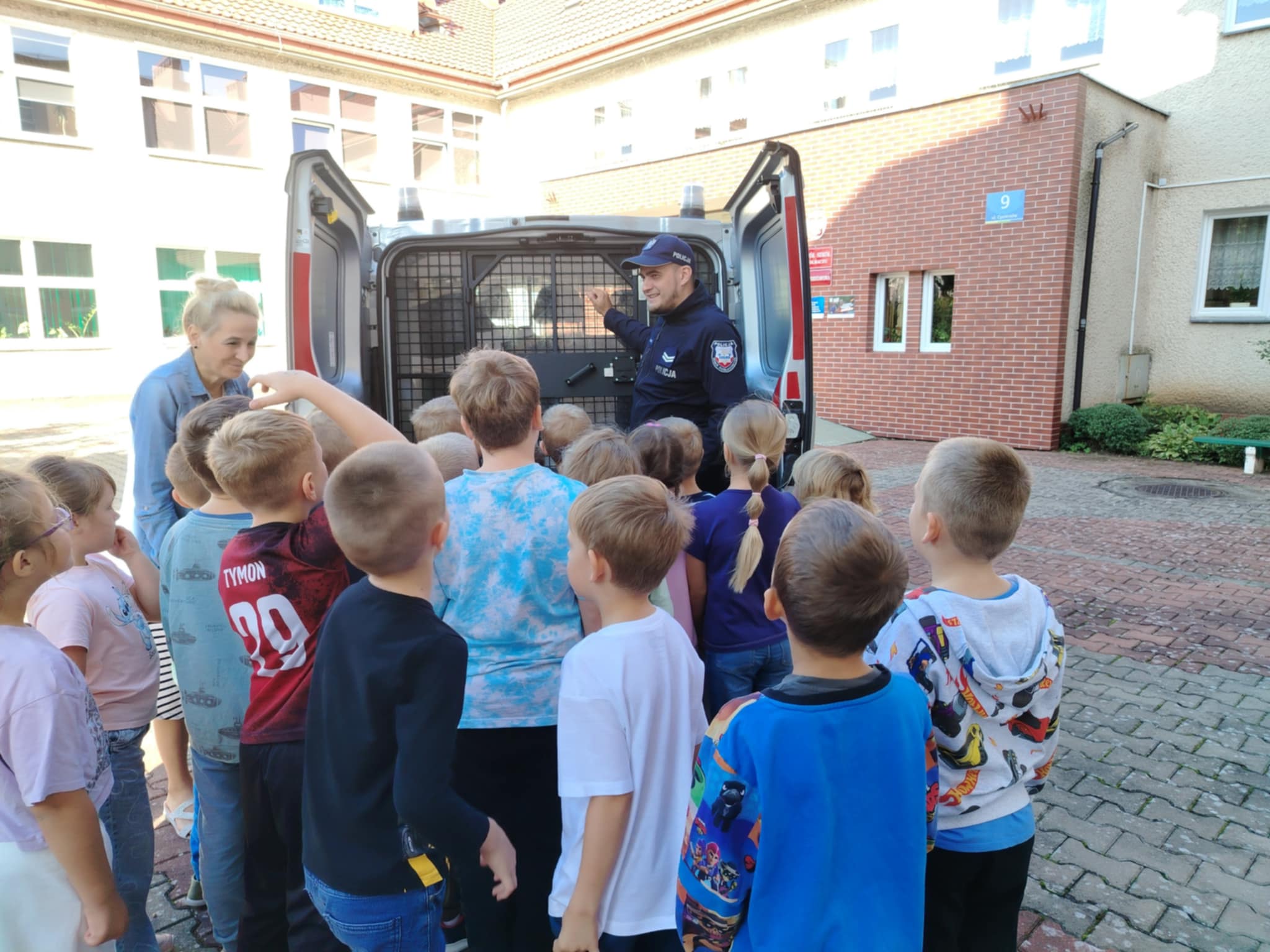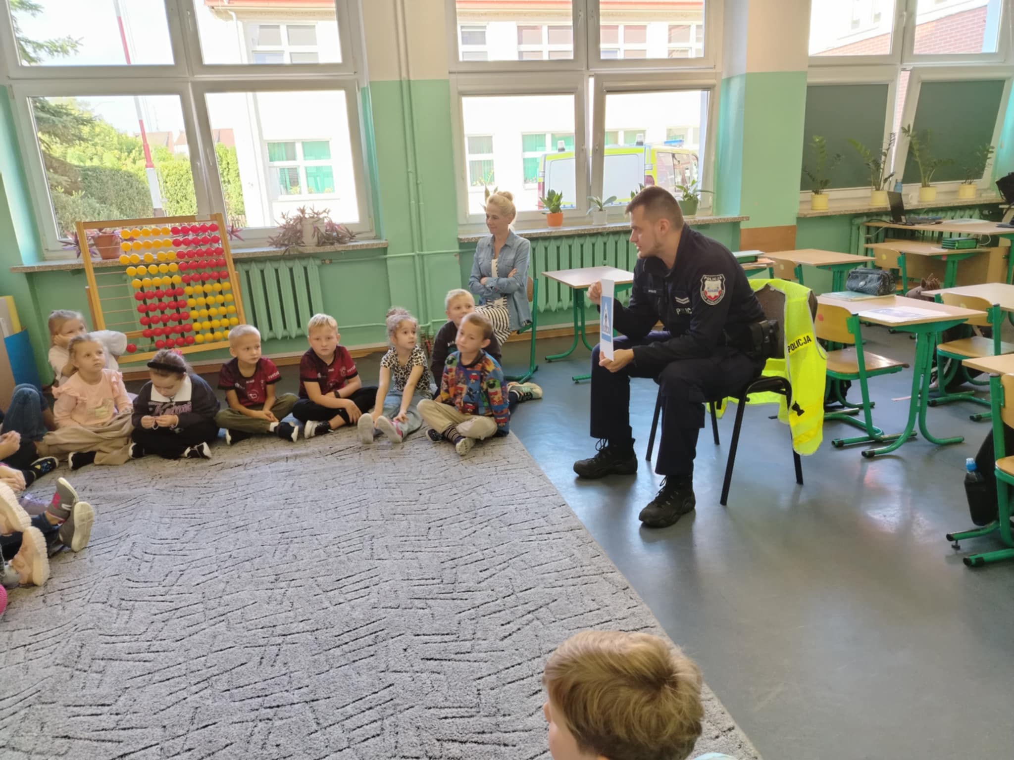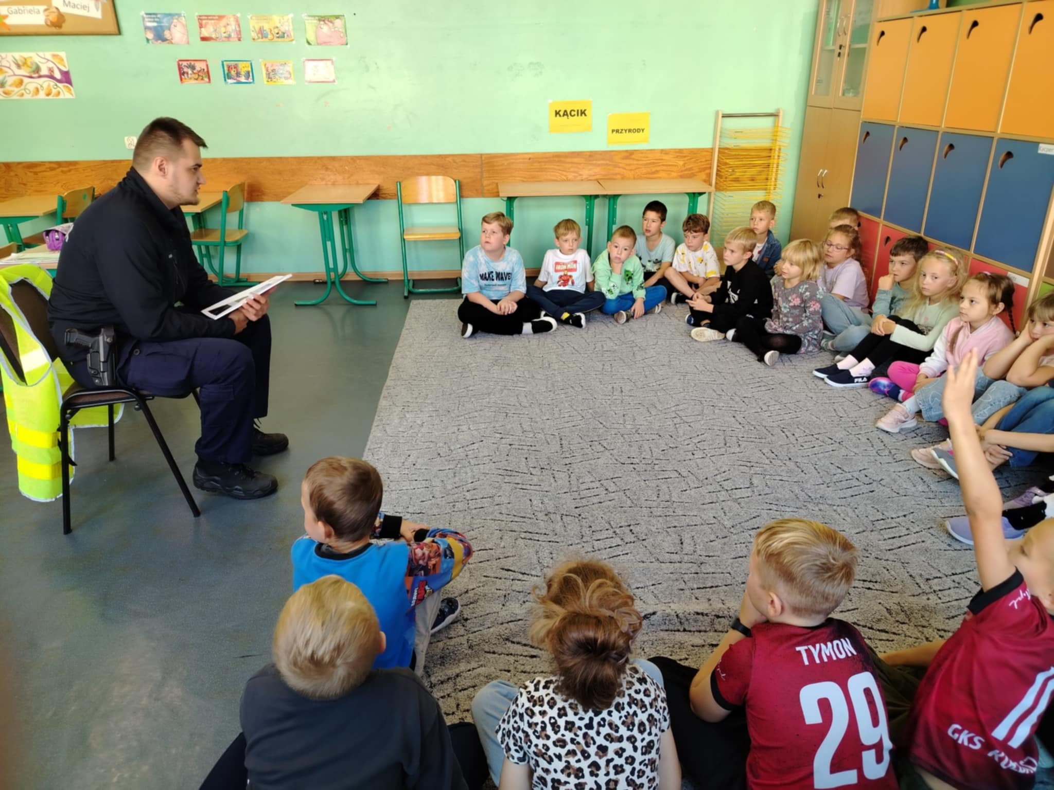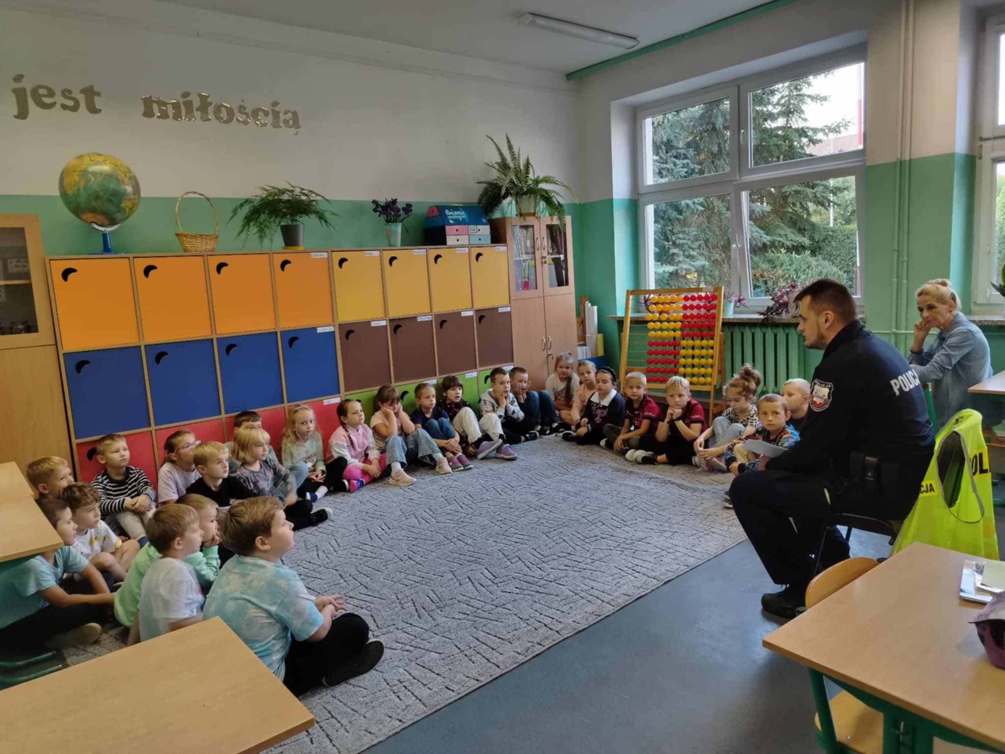 19.09.2025 r., uczniowie klasy I uczestniczyli w spotkaniu z policjantem. Podczas wizyty przypomniano zasady bezpiecznego poruszania się po drodze, właściwego zachowania wobec osób obcych oraz korzystania z numerów alarmowych. Dzieci aktywnie brały udział w rozmowie i zadawały pytania.