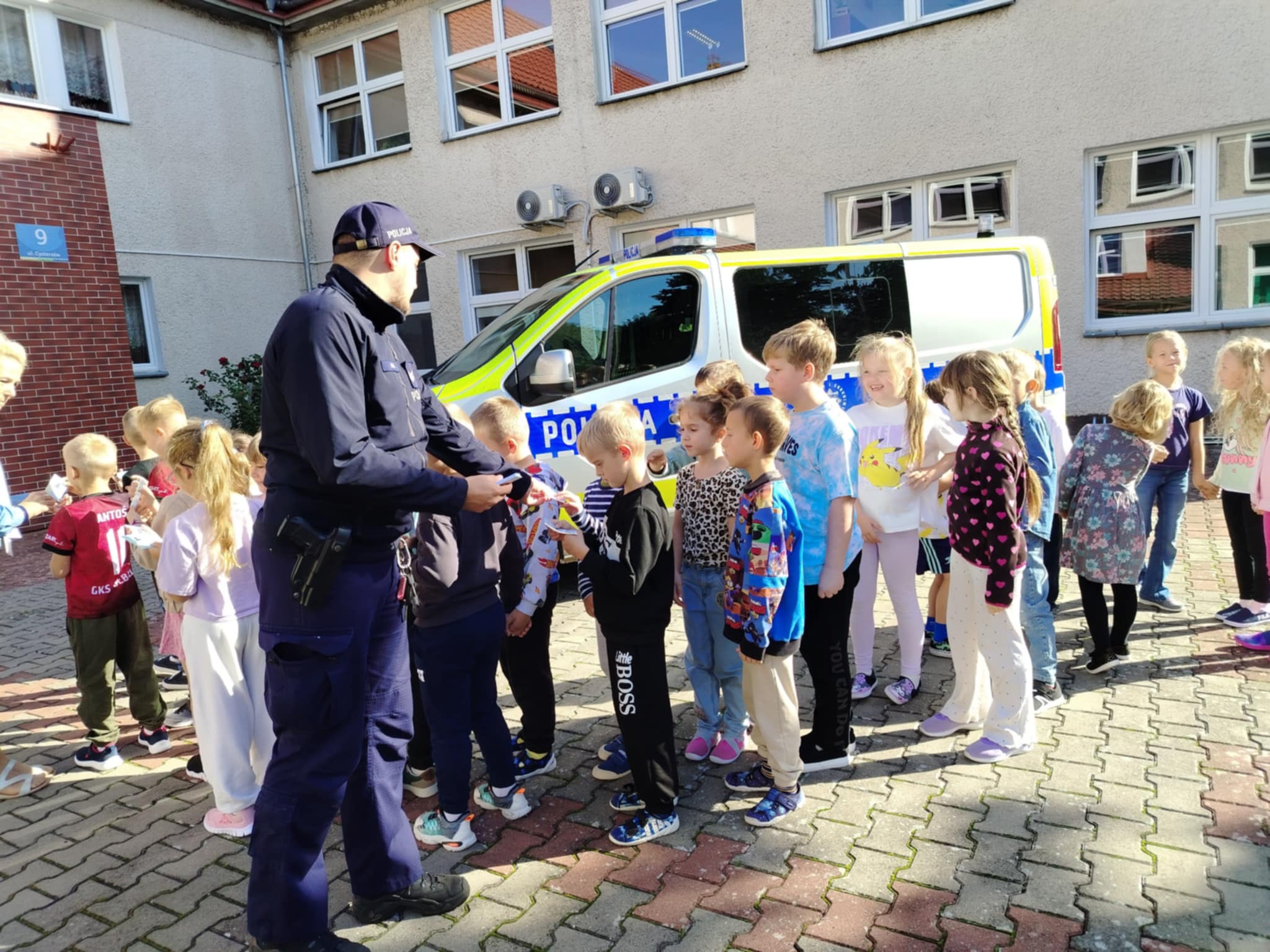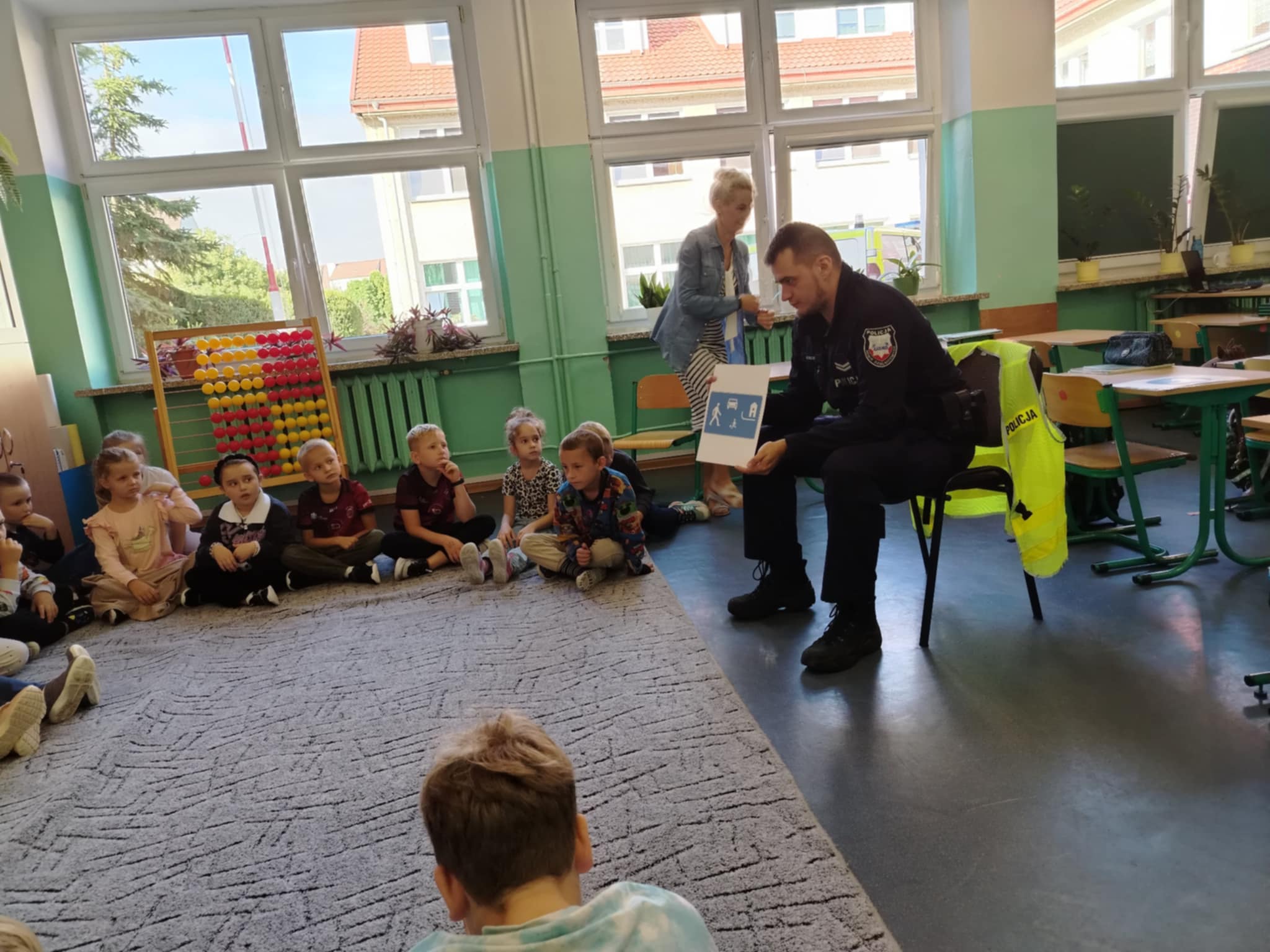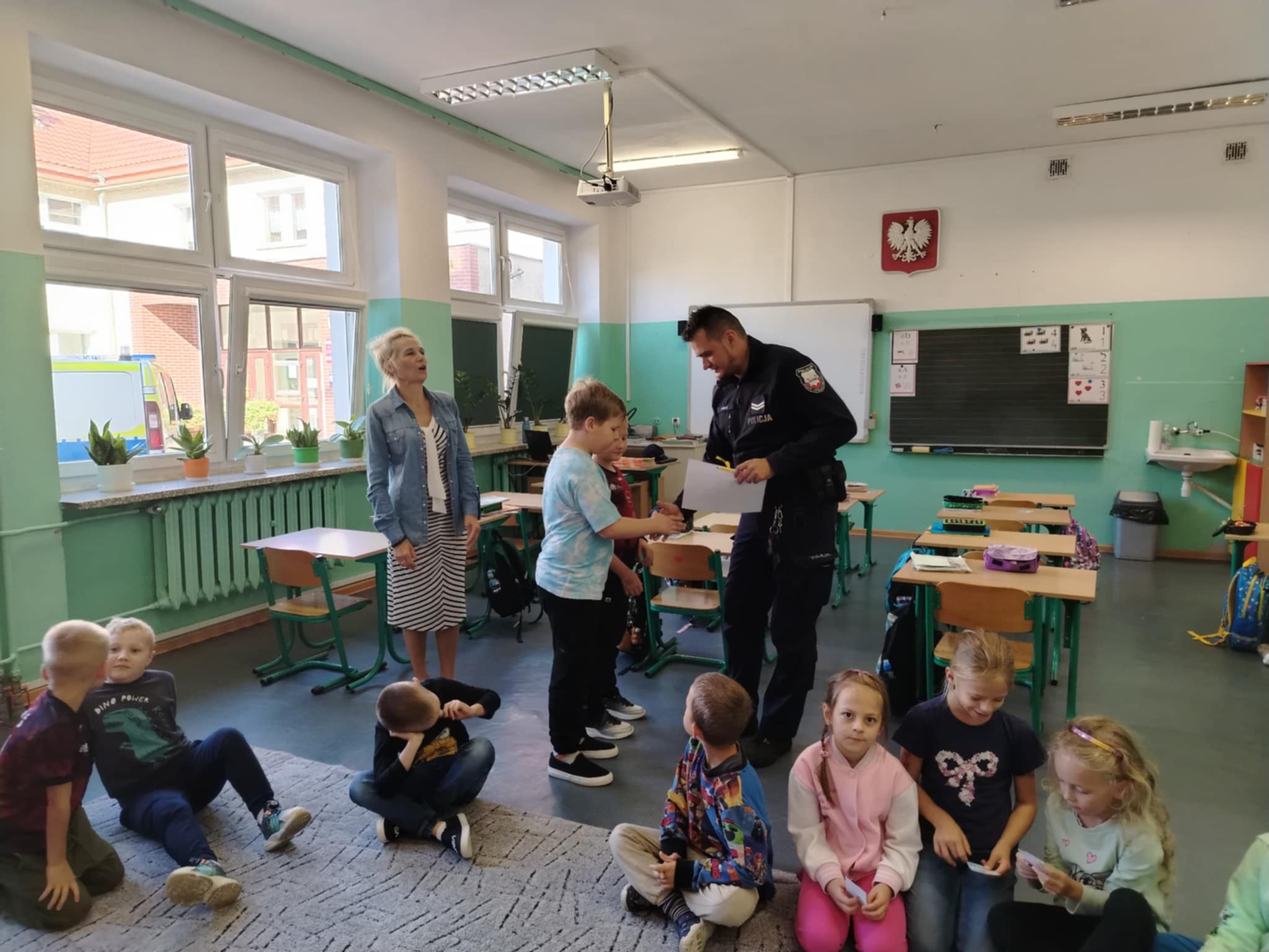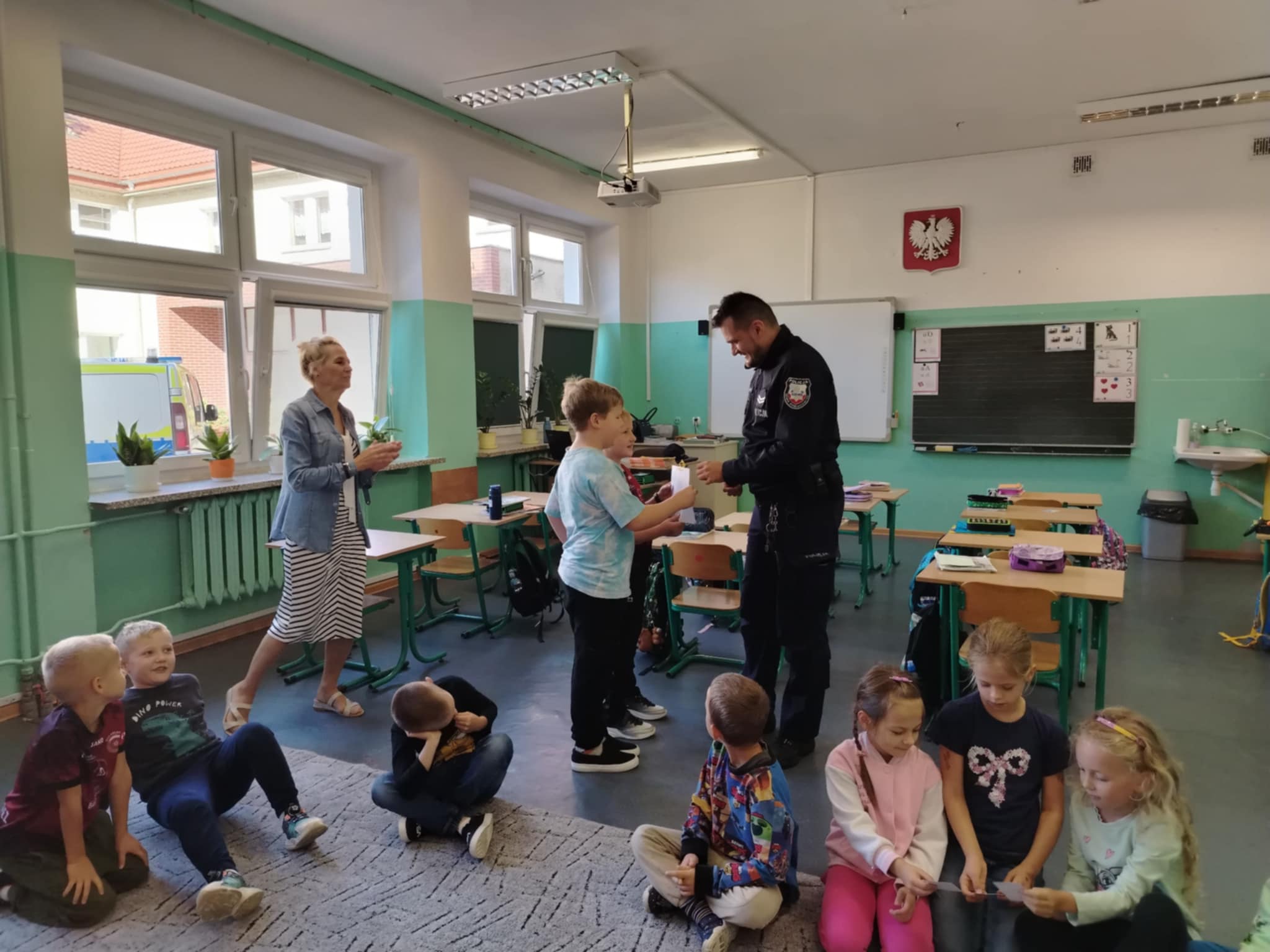 19.09.2025 r., uczniowie klasy I uczestniczyli w spotkaniu z policjantem. Podczas wizyty przypomniano zasady bezpiecznego poruszania się po drodze, właściwego zachowania wobec osób obcych oraz korzystania z numerów alarmowych. Dzieci aktywnie brały udział w rozmowie i zadawały pytania.