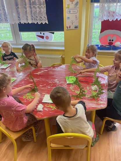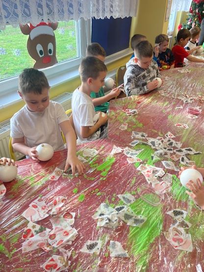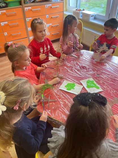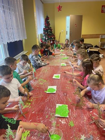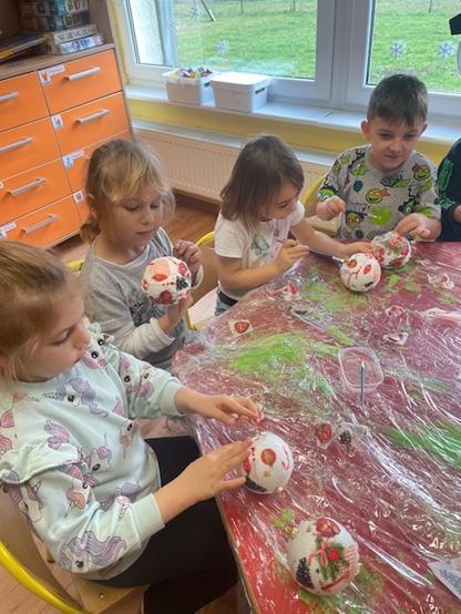 W trakcie warsztatów, dzieci samodzielnie tworzyły ozdoby świąteczne. Malowały farbami drewniane stojaki oraz ozdabiały bombki ze styropianu kawałkami pociętych serwetek.