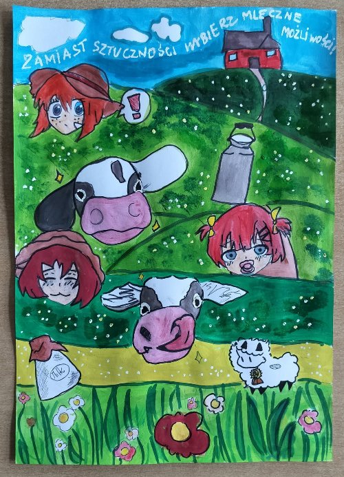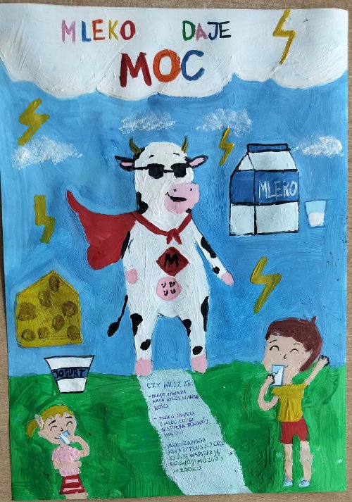 Z wielką radością informujemy o wspaniałym sukcesie naszych uczniów w wojewódzkim konkursie plastycznym „ Moja mleczna kraina”, który cieszył się ogromnym zainteresowaniem – na konkurs wpłynęło aż 300 prac z całego regionu. Celem konkursu było promowanie wiedzy o roli mleka i produktów mlecznych w codziennej diecie, a także ukazanie znaczenia rolnictwa i lokalnych tradycji związanych z produkcją mleka.