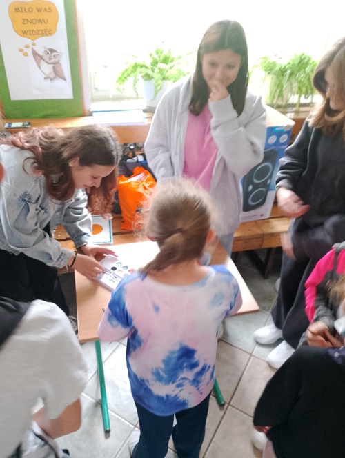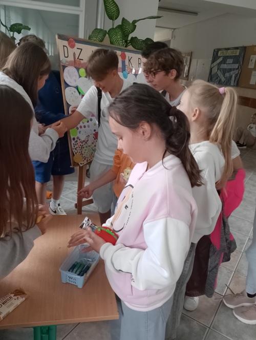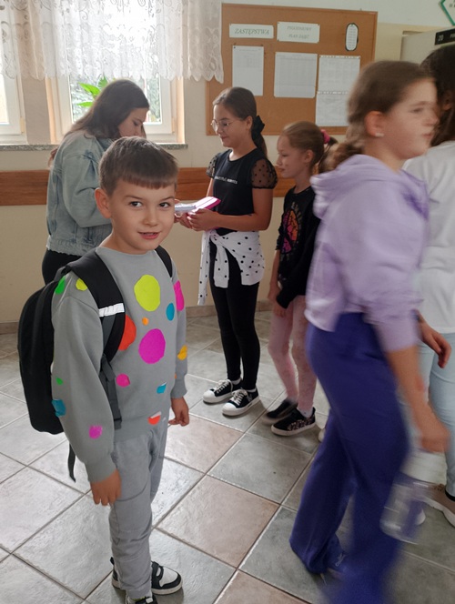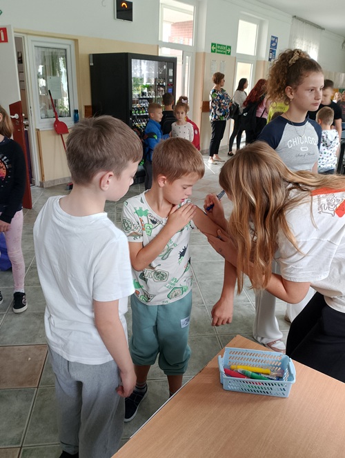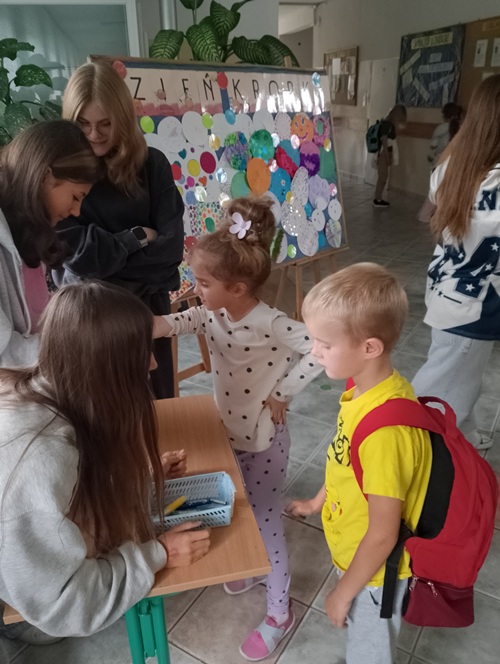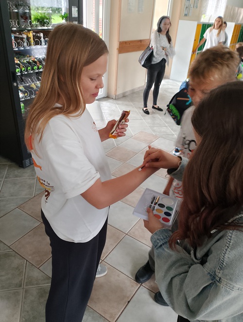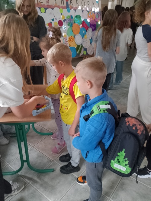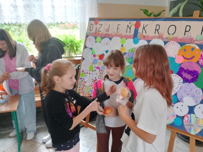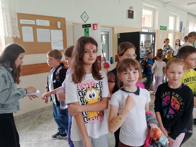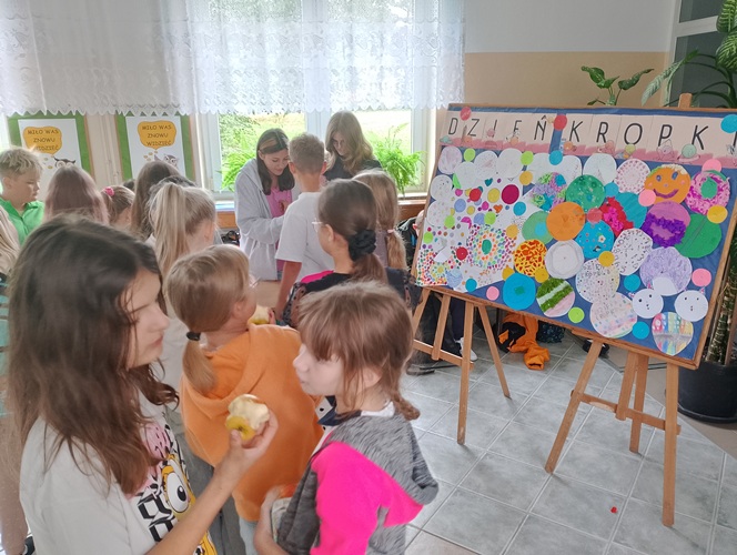 Podczas długiej przerwy, przy dźwiękach muzyki, starsi uczniowie malowali na twarzach młodszych dzieci kolorowe kropki. Powstała również specjalna tablica inspiracji, na której każdy mógł zaprezentować swoją wyjątkową kropkę – symbol twórczości i pomysłowości.