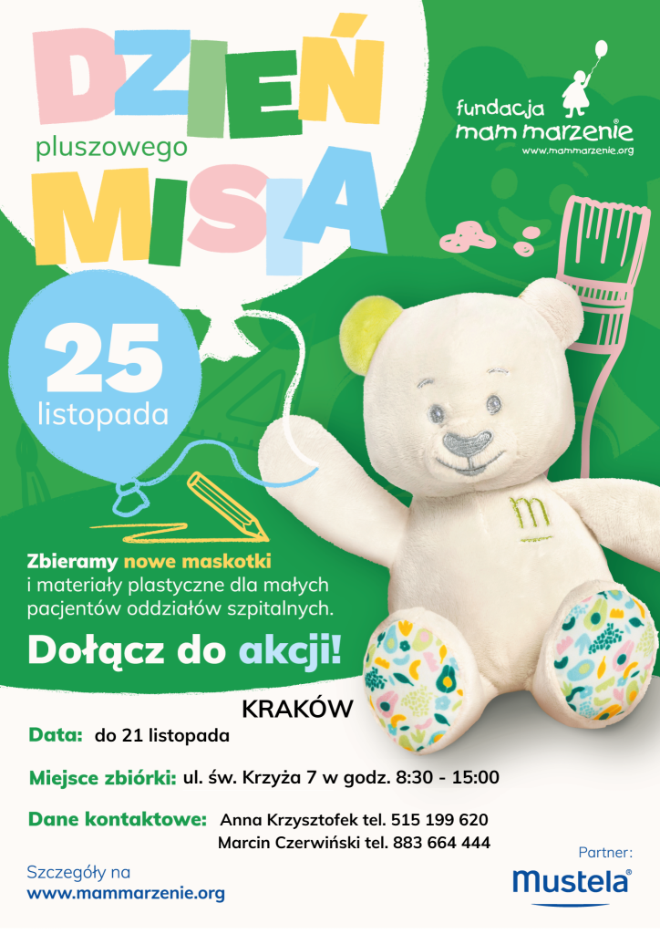 Szkolny Klub Wolontariusza serdecznie zaprasza do udziału w kolejnej zbiórce nowych maskotek i materiałów plastycznych dla małych pacjentów oddziałów szpitalnych. Okazją do przeprowadzenia zbiórki jest obchodzony 25 listopada Międzynarodowy Dzień Pluszowego Misia.