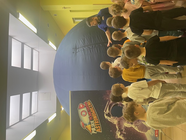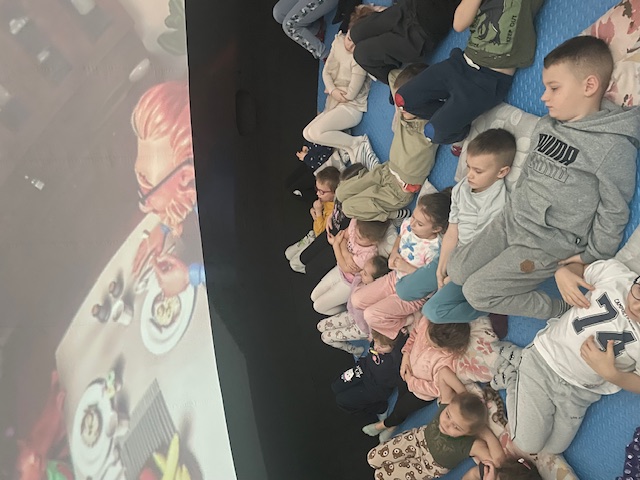 18 lutego dzieci uczestniczyły w seansie edukacyjnym w mobilnym planetarium. Pokaz dla każdej z grup odbył się w specjalnej kapsule w kształcie półkuli, która dawała wrażenie przestrzeni kosmicznej. W jednej chwili dzieci przeniosły się w zagadkowy świat kosmosu oraz świat przyrody. Pokaz dostarczył wszystkim wielu niezapomnianych, kosmicznych wrażeń.